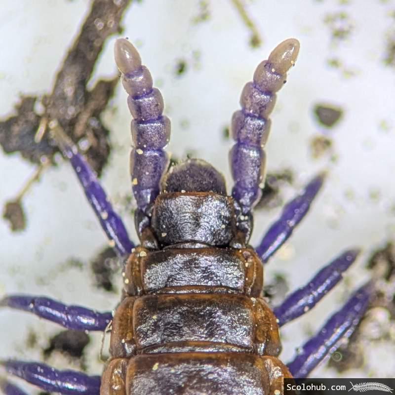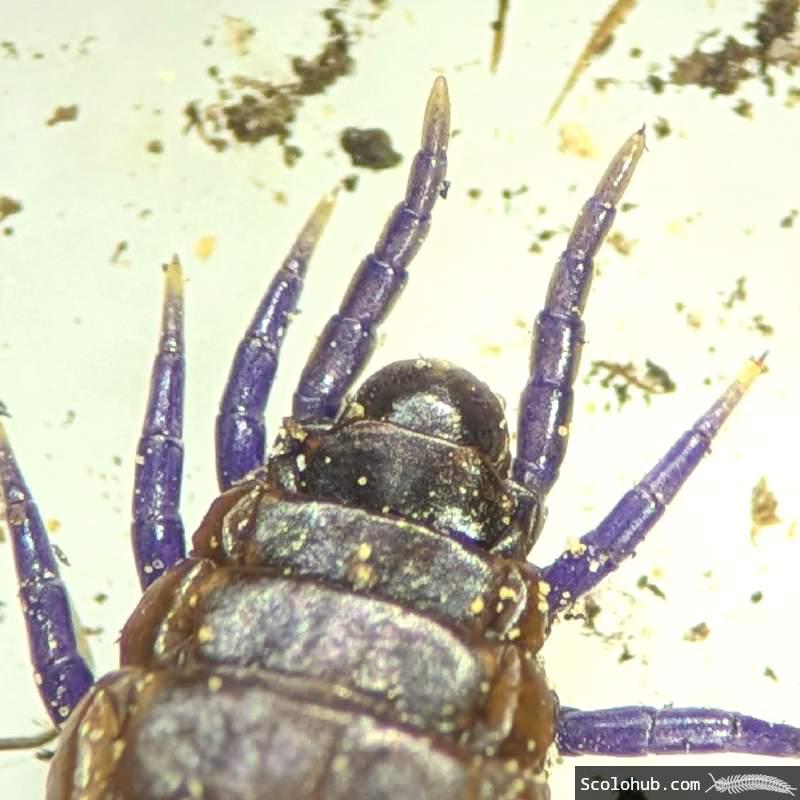 Sie besitzt 107 bis 125 Beinpaaren, ihre Körperfärbung reicht von hell- bis nussbraun, während die Beine charakteristisch violett gefärbt sind.