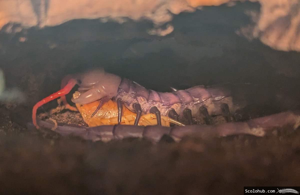 Da der Panzer nicht mitwächst, ist eine regelmäßige Häutung notwendig. Nach erfolgreicher Häutung frisst der Skolopender seine Exuvie, um wertvolle Nährstoffe für die Aushärtung der neuen Cuticula zurückzugewinnen. Anzeichen einer bevorstehenden Häutung sind blassere Färbung, reduzierte Aktivität und Futterverweigerung1.