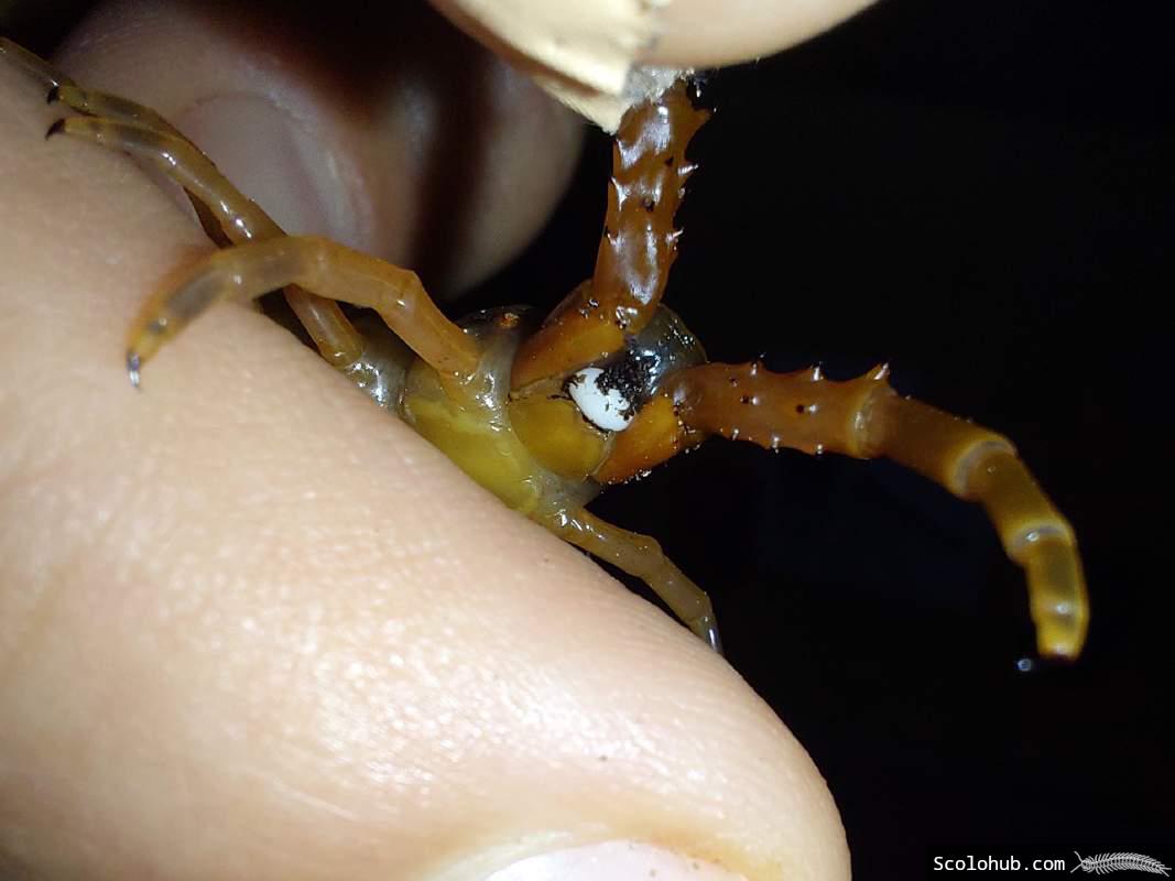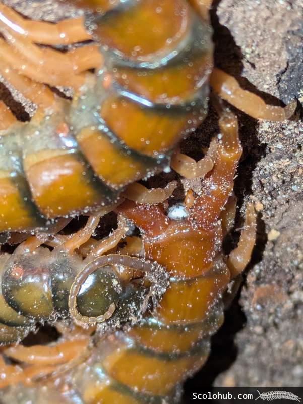 Aufnahme der Spermatophore bei SkolopendernWährend der Paarung nehmen die Weibchen die Spermatophore des Männchens auf. Aufgenommene Spermatophore bei Ethmostigmus trigonopodus Aufgenommene Spermatophore bei Ethmostigmus trigonopodus
